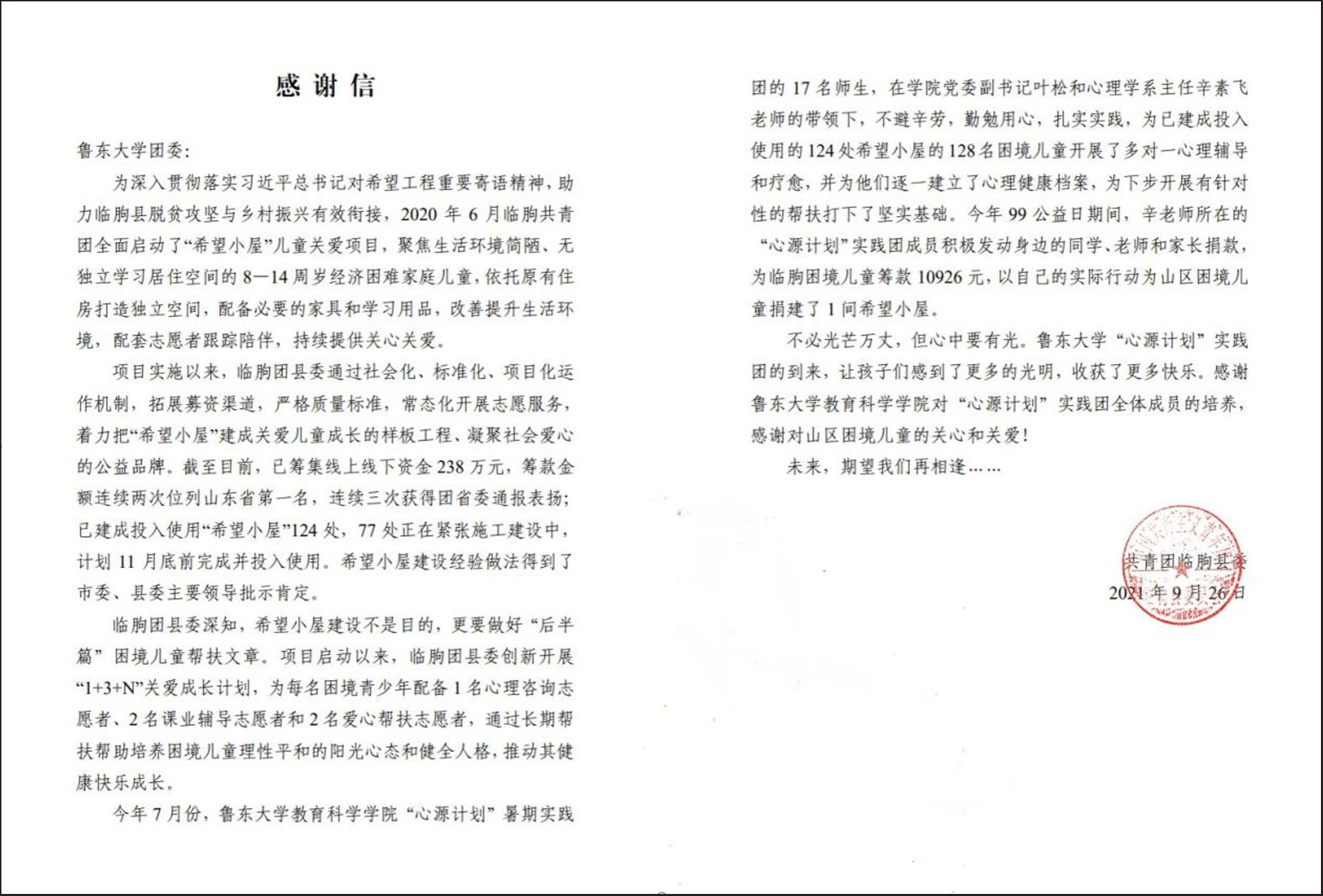2.团队在临朐期间自发为临朐县捐赠一所希望小屋,并收到了共青团临朐县的一封感谢信与一面锦旗。